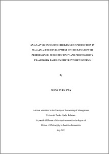 Wong, Yuen Hwa (2025) An analysis on native chicken meat production in Malaysia: the development of chicken growth performance, feed efficiency and profitability framework based on different diet systems. PhD thesis, UTAR.
