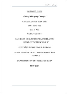 This business plan introduces GalaxyWi, an innovative wireless laptop charger, designed to meet the increasing demand for portable, efficient and cable-free charging solutions. GalaxyWi offers a high-value proposition in the growing landscape of mobile computing accessories. As laptops continue to evolve toward minimalistic designs, the product responds to users’ desire for enhanced mobility, workspace organisation and technological sophistication. Our proposed business model integrates the design, manufacturing and assembly of key components, such as wireless transmitters, converters, adapters and receivers into a slim, lightweight, and user-friendly device. A distinctive feature of GalaxyWi is its customisation service, enabling customers to personalise the product with names, which elevates brand engagement and appeals to individual consumer identities. The device supports mainstream laptop brands, also in fulfilling a gap in the current wireless charging market. Targeting higher education group of people, and freelancers, GalaxyWi will be distributed through online platforms and roadshows. Our phased marketing strategy spans from brand awareness to advocacy, incorporating digital engagement, influencer collaborations, and retail displays. Financial projections estimate steady revenue growth, underpinned by effective cost management, a lean workforce, and a focus on scalability. inFit Sdn. Bhd. operates with a a single floor structure, manufacturing, stock storage, and logistics, as well as to accommodate executive offices, a discussion room, pantry, and other administrative functions. This layout reflects our emphasis on operational efficiency and cross-department collaboration. With a dedicated founding team, cost-conscious operations and a scalable business model, inFit Sdn. Bhd. is well-positioned to lead the wireless charging market segment with GalaxyWi. Keywords: Wireless charging, laptop charger, Galaxy Wi, consumer electronics, fast charging, product customisation, mobility, portable charger, adapter, digital marketing, retail distribution. Subject Area: TK7800–8360 Electronics