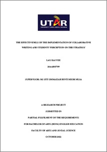 Lau, Kai Yee (2023) The effectiveness of the implementation of collaborative writing and students’ perception on the strategy. Final Year Project, UTAR.